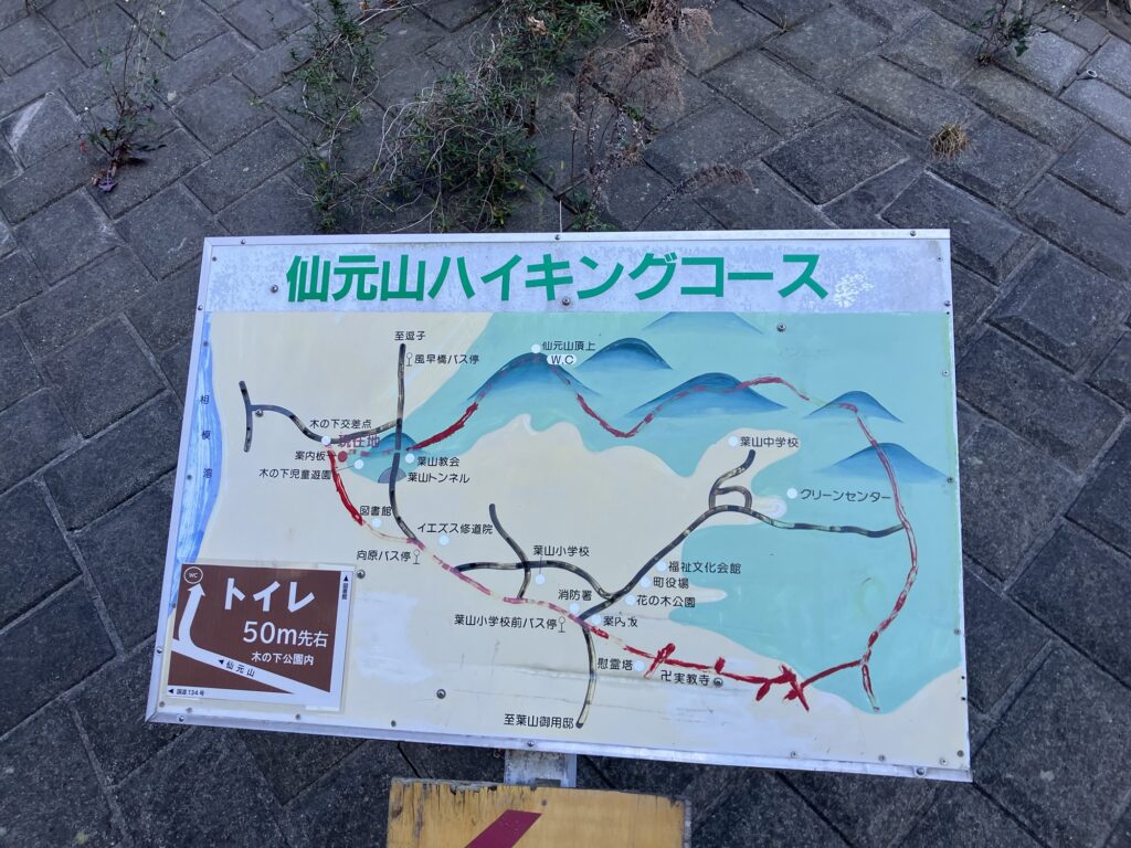 まず、仙元山に登って、ソッカというところにいって、森戸川林道で渓流沿いを歩いて、上二子山に登って、あとは東逗子に向かって下る。