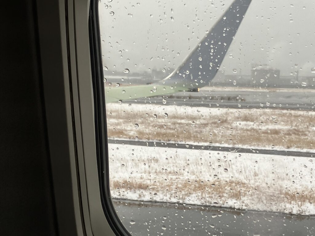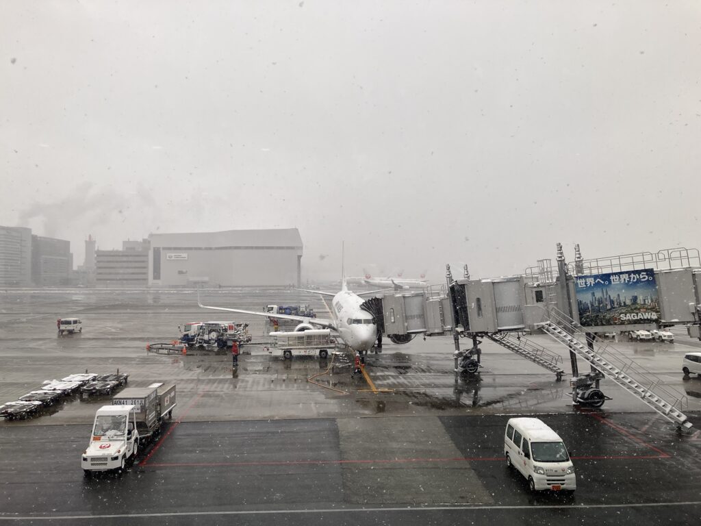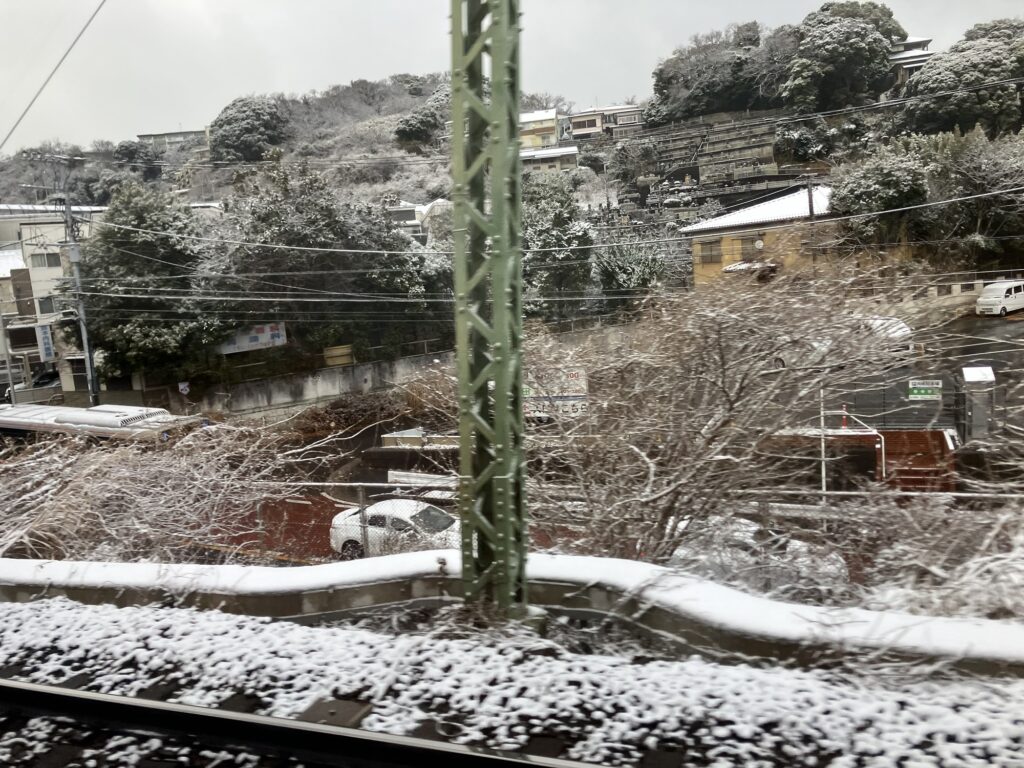 1日目、2026/2/8、関東は前日から雪。幸い羽田空港までの電車は動いていた。横浜あたりは雪景色。