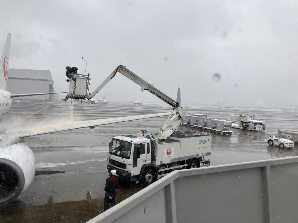 黄色と緑色の液体を翼に吹きかけていた。翼が緑になっているので、着雪防止剤かな。