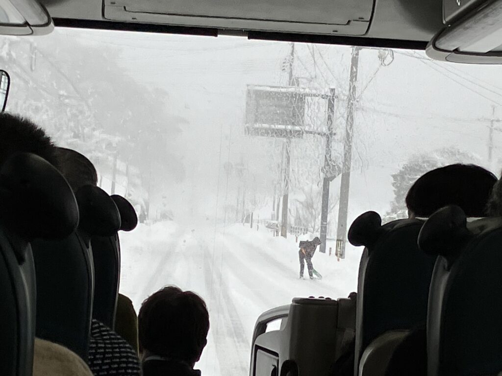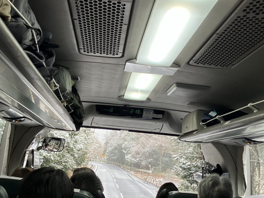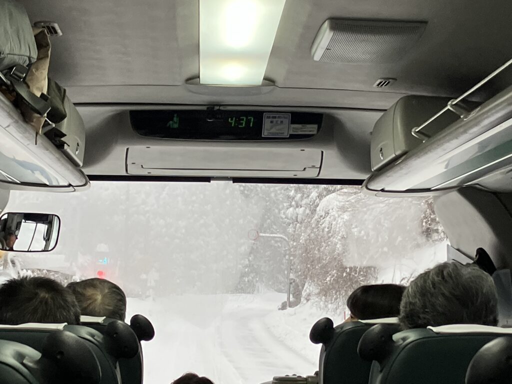 14時バス出発、座席にUSB充電の口あり。車内Wi-Fiはないみたい。雪道安全のためにドライバー二人体制。そんなことしてもらえるんだ。安心だけど経費はどこから出るのだろうか?