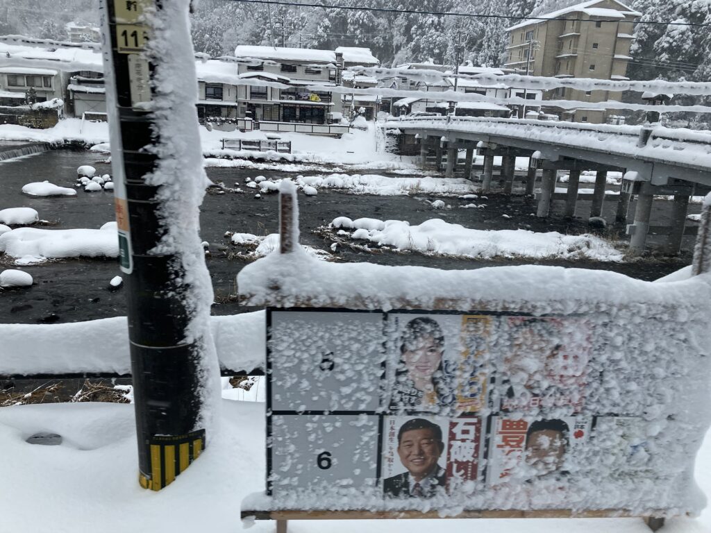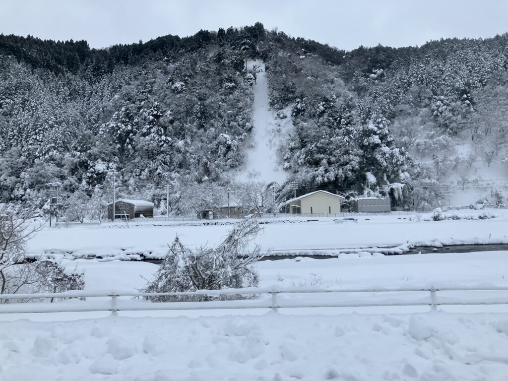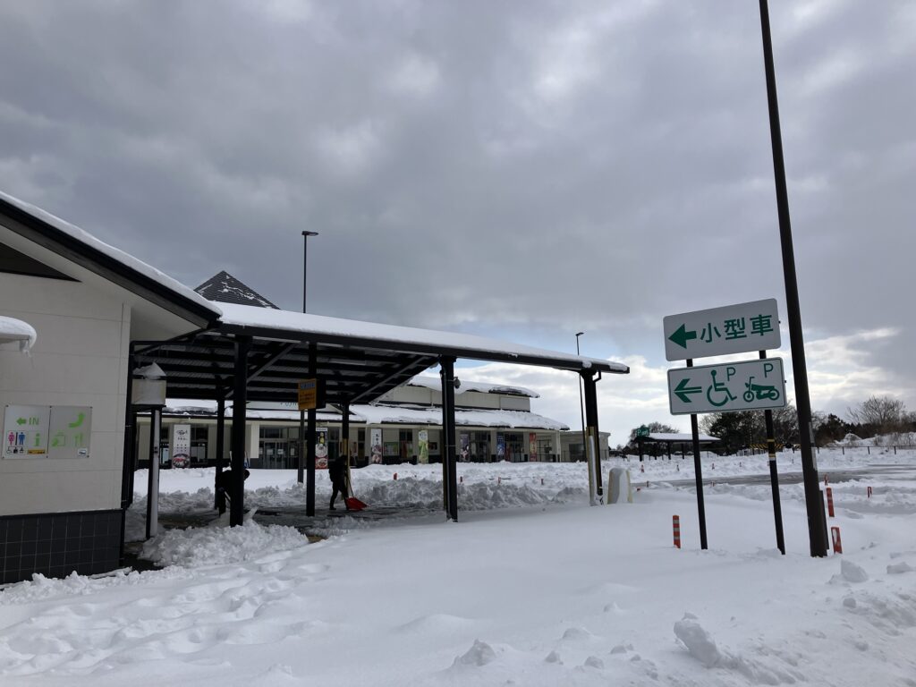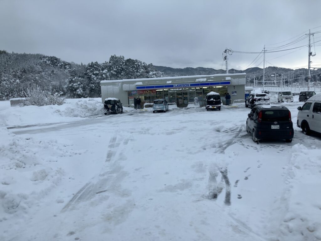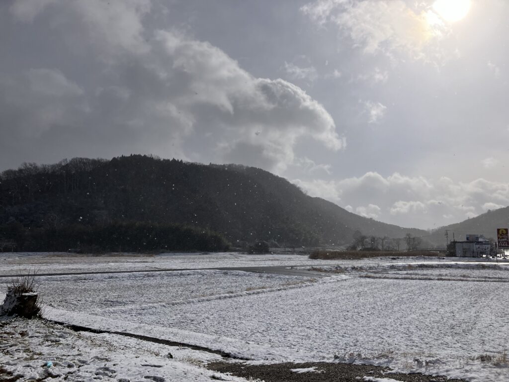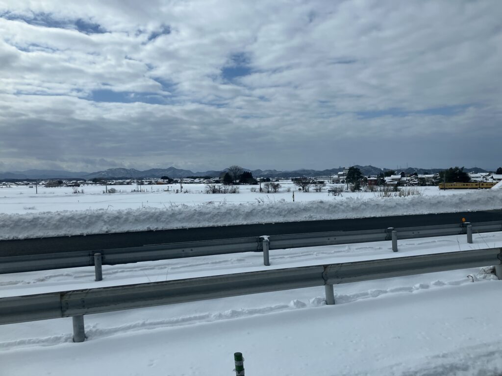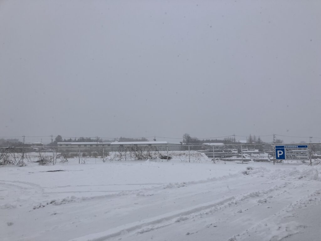 道に雪はないけど畑や路肩は雪をかぶっている。結構ガンガン雪降ってる。景色が霞むくらい