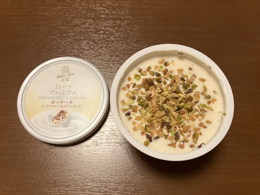 風呂上がりに白バラプレミアムアイスを食べる。カッサータ ミックスフルーツ&クリームチーズ。オレンジピールとかピスタチオが入ってる。