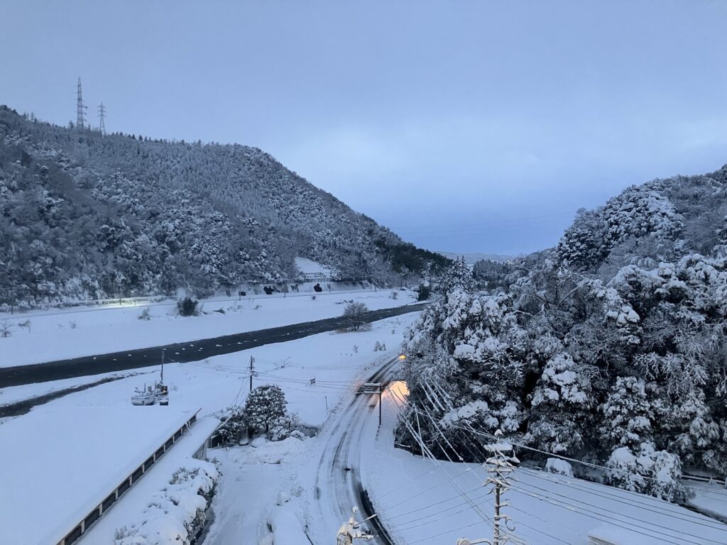 山に入り、雪が深くなってくる。津山あたり、道も轍以外が白い。