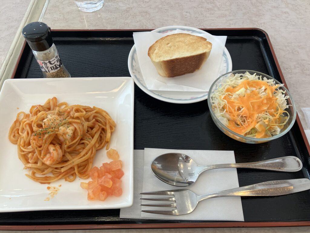 焼きそばにするつもりが、おこりんぼうパスタセットにしてみた。おいしかった。ミルクパンはふわふわで甘かった。