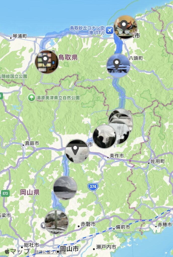 今回の行程、1日目は岡山空港から鳥取砂丘にいって三朝(みささ)温泉宿泊、2日目は三朝温泉から島根に向かって足立美術館見て、また鳥取に戻って南下して岡山空港へ。