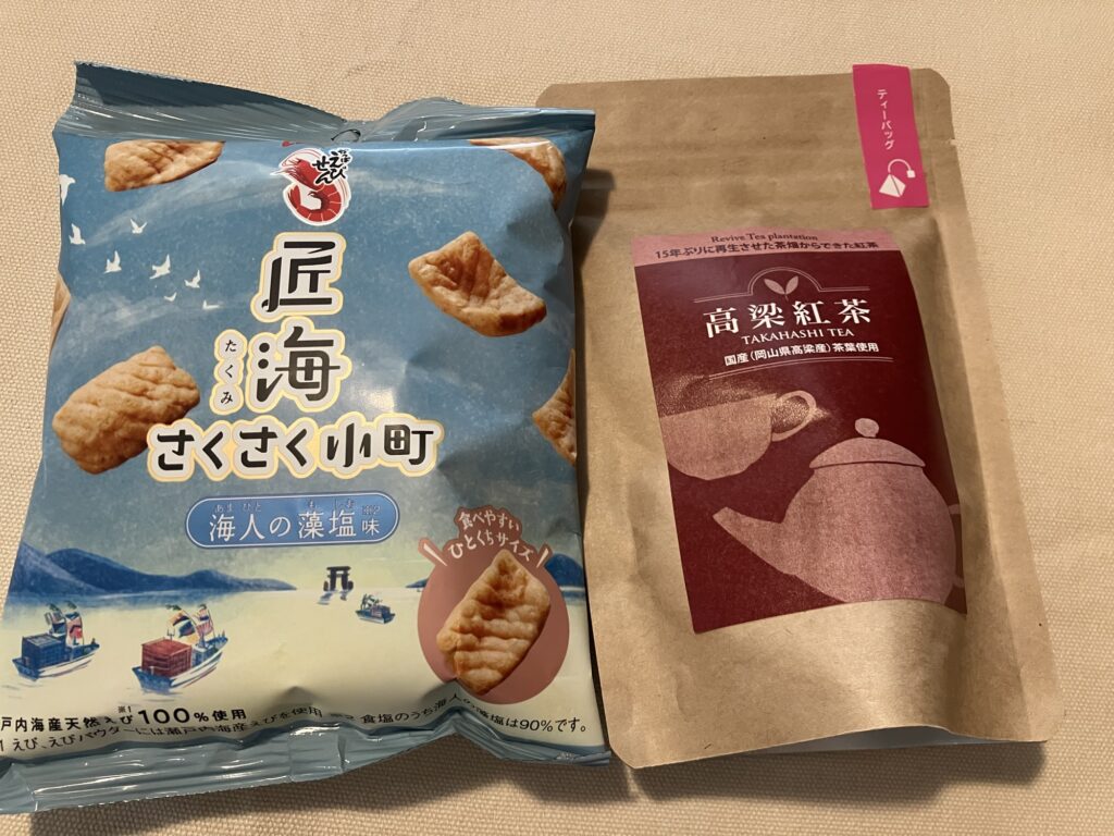 途中、高梁PAでトイレ休憩。広島のご当地かっぱえびせん「拓海」と高梁紅茶を買ってみた。